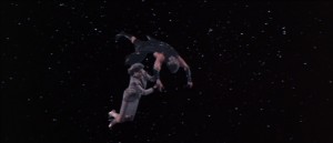 So Superman and Nuclear Man fly up into space again, where they battle in zero-G (while obviously being filmed standing on a bluescreen floor–you can even see a haze where Superman’s cape casts a shadow).