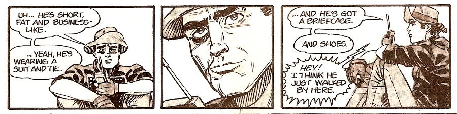 Little does Scorpion know that Richard has stolen the clothes (and briefcase, and shoes) from a short, dumpy businessman in the men’s room. He meets up with teammate Rachel outside to make his getaway, when they run into the businessman’s wife, who has followed her husband here, thinking he’s having an affair.